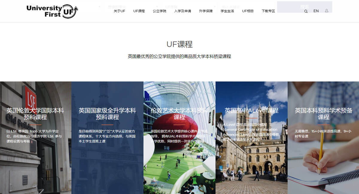 University First 英國(guó)公立預(yù)科 ( 簡(jiǎn)稱(chēng) UF) 是由多所英國(guó)歷史最悠久、規(guī)模最大、教學(xué)資源最豐富的公立學(xué)院面向國(guó)際學(xué)生提供的課程。英國(guó)公立學(xué)院由英國(guó)政府出資建立,每年獲得來(lái)自政府?dāng)?shù)千萬(wàn)英鎊的撥款,并接受來(lái)自英國(guó)官方教育質(zhì)量標(biāo)準(zhǔn)署(Ofsted)每年的定期檢查。每所大型公立學(xué)院都擔(dān)負(fù)著為數(shù)以萬(wàn)計(jì)的英國(guó)本土學(xué)生提供優(yōu)質(zhì)教育的重要使命。University First 區(qū)別于一般英國(guó)預(yù)科課程,具有課程專(zhuān)業(yè)化、教學(xué)規(guī)范化和升學(xué)透明化的顯著優(yōu)勢(shì)。